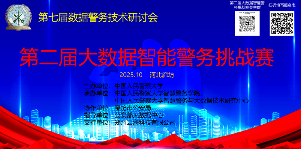 为推进警务大数据和人工智能理论、方法与技术研究,加快释放数据动能,服务实战应用,推动“人工智能+深入警务创新”,服务公安机关新质战斗力人才培养,提升实战化教学水平,高质量为党育人、为国育才、为警铸剑,特举办大数据智能警务挑战赛。